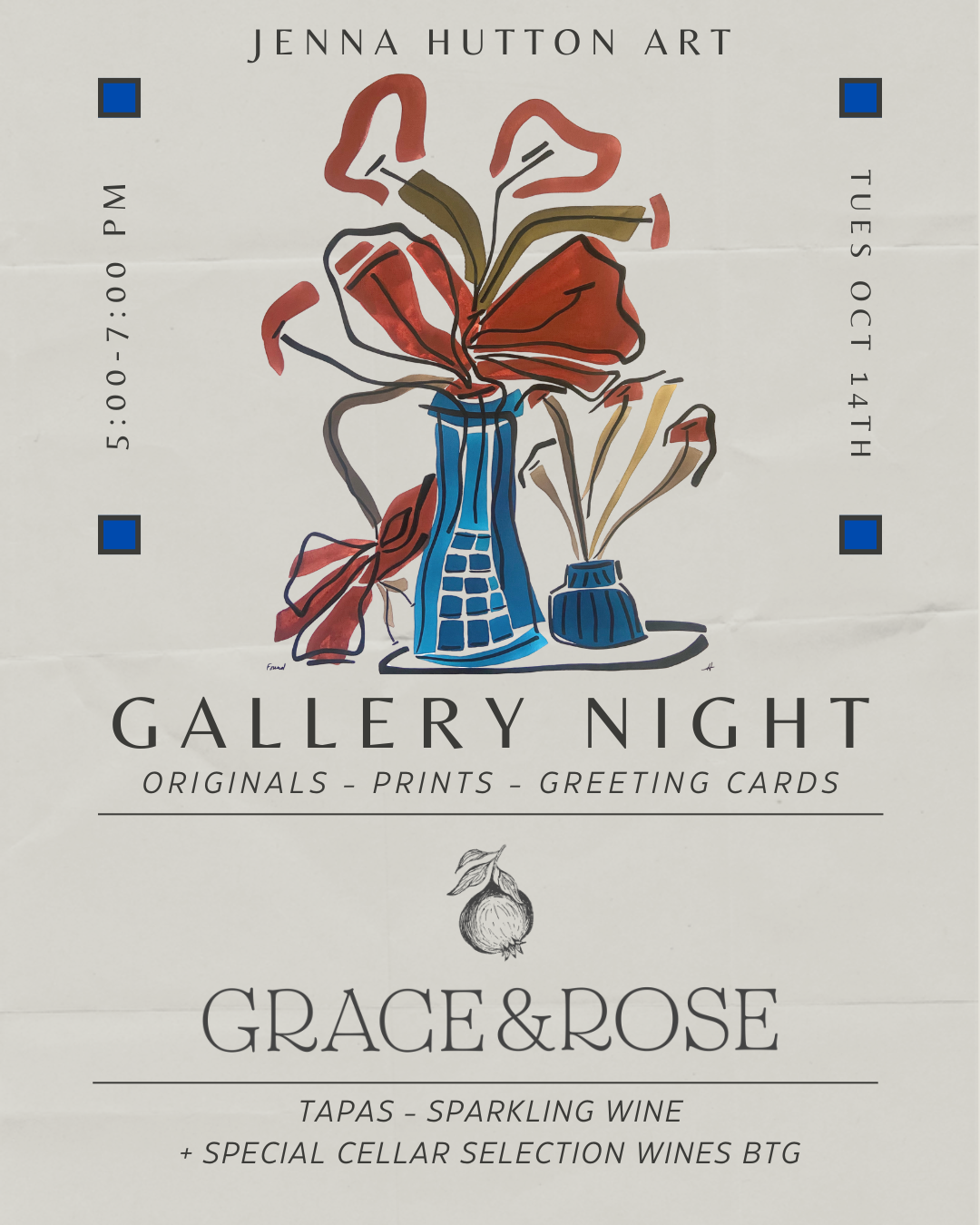 Join us for a special Gallery and Wine Night featuring Jenna Hutton Art! Meet Jenna and sip on some wine as we turn our farmhouse into an art gallery featuring a collection of her artwork that will be available to purchase. In addition to our regular wine list, we’ll be opening some special Cellar Selections wines offered BTG during the event! A tapas inspired menu will also be available from our kitchen. No reservations necessary.